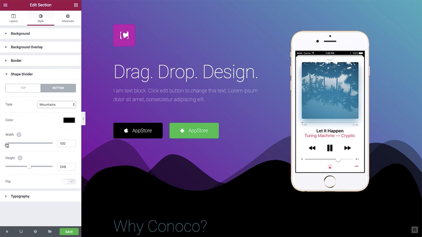 The Shape Divider feature uses highly optimized SVG shapes, that are manipulated and customized on the frontend editor.